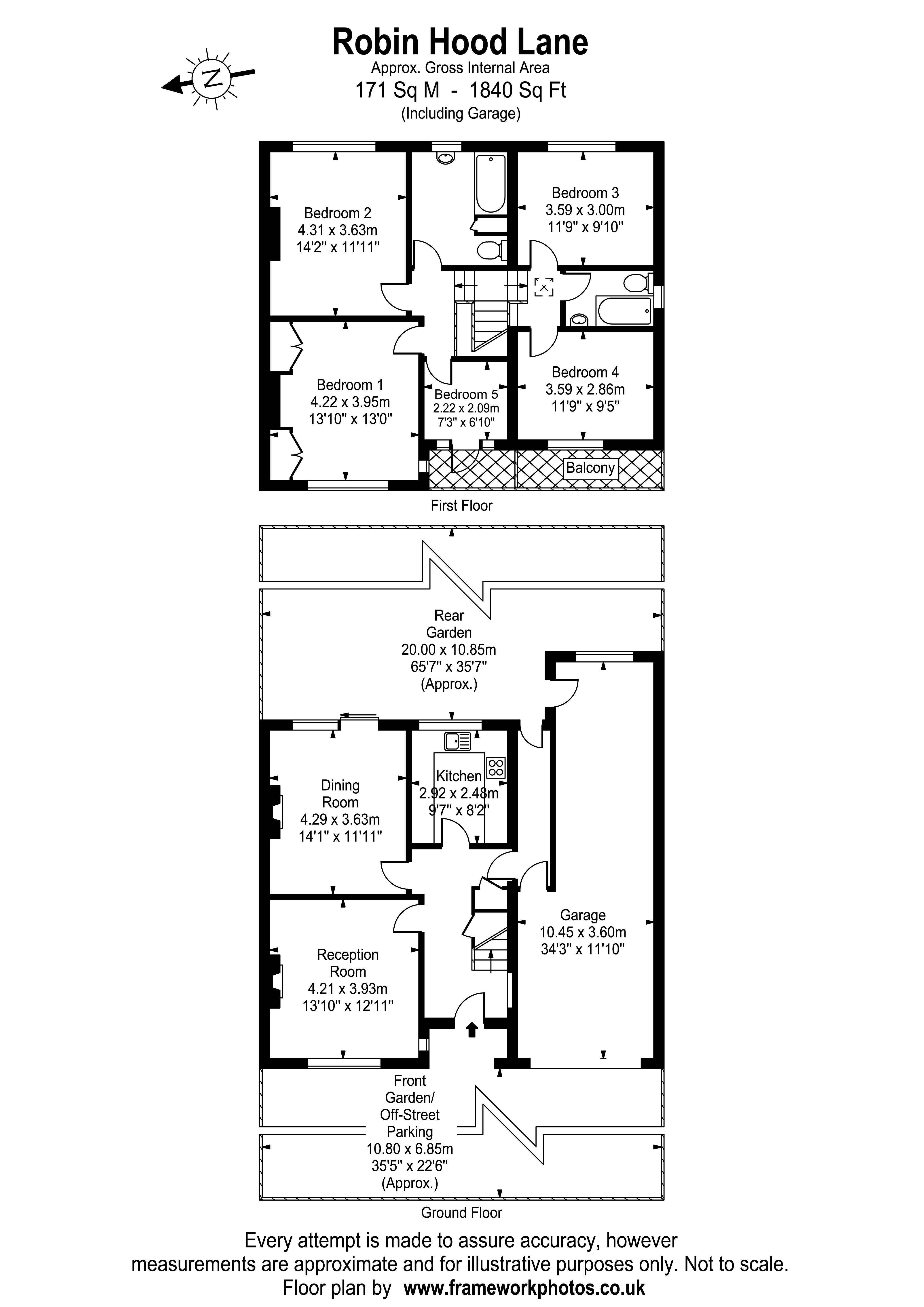 The accommodation is arranged laterally over two floors. The ground floor comprises a good size entrance hall, two large independent reception rooms, kitchen, and an inner corridor giving way to the garden and garage. Upstairs provides four double bedrooms supported by two bathrooms, and a fifth singe bedroom (or study) with ornamental front aspect balcony.