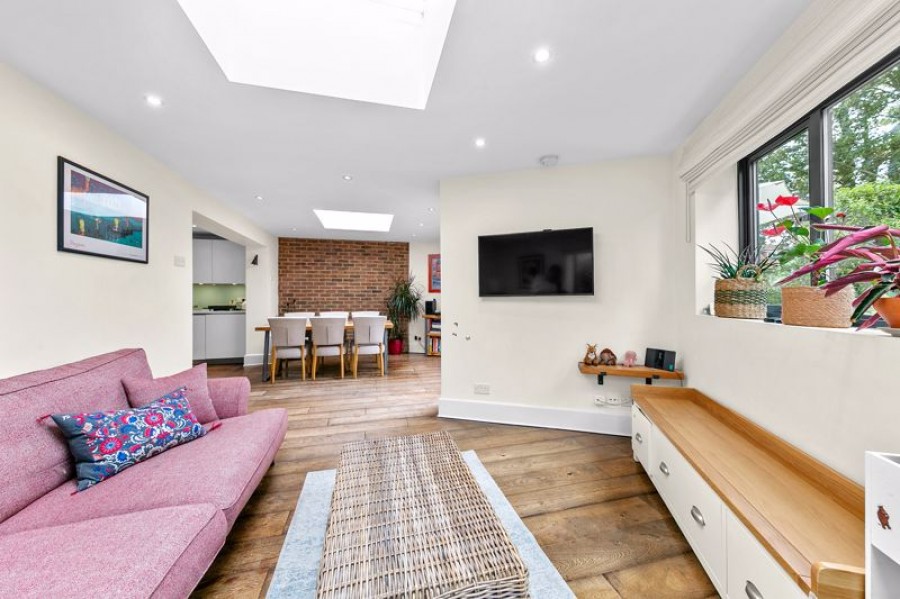 Internally the accommodation is rather flexible with use of three bedrooms or instead with two bedrooms and three adaptable reception areas. The main feature of the property is a bespoke, fully integrated kitchen, designed and fitted by Callaghan Interiors of Teddington, including a smart island unit, concealed and suspended lighting, and a useful pantry. The kitchen flows seamlessly into a modern extension, architecturally designed to accentuate the shape of the garden, complete with underfloor heating below wood floor-boards and excellent natural light generated via bi-fold doors, two roof lights and feature windows.
