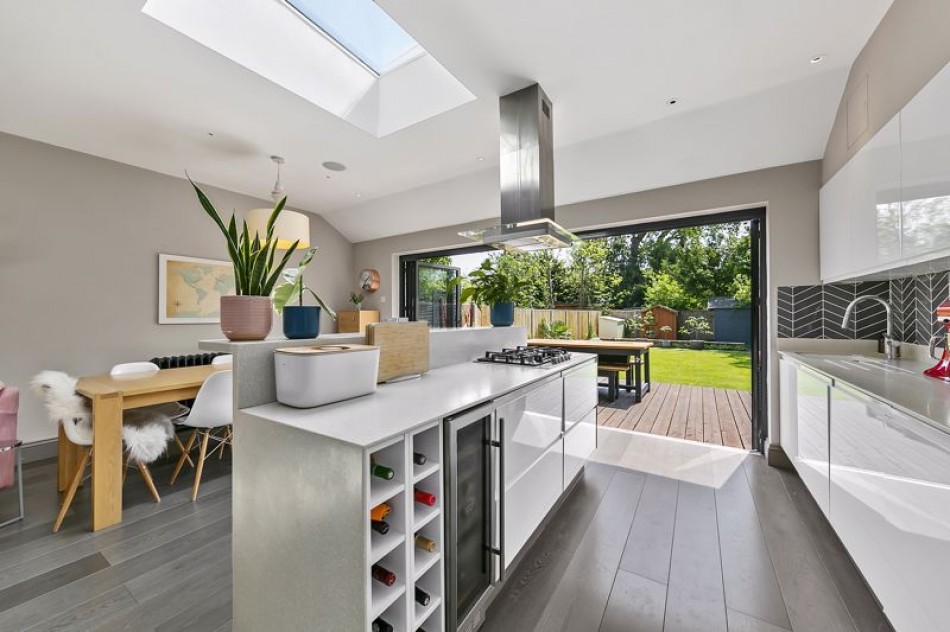 At the back of the house the original middle reception room and single kitchen are now combined with a 'full width' rear extension to create a show stopping open-plan kitchen/dining/family room with skylight and bi-fold doors opening out to same-level decking.